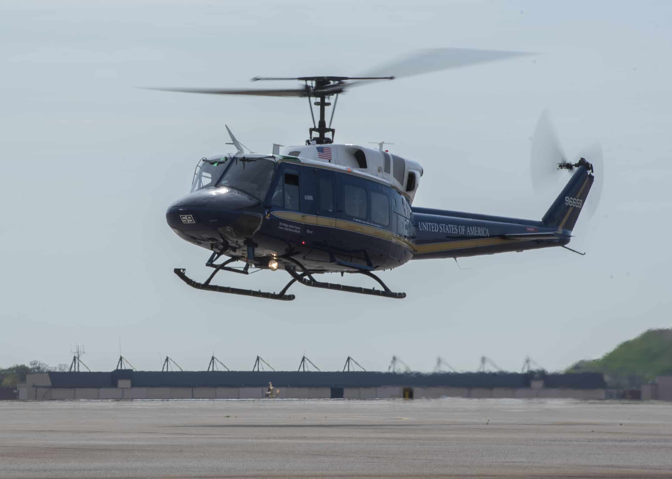 Photo: An UH-1N Iroquois lands at Joint Base Andrews, Md., April 13, 2017. The helicopters belonging to the 1st Helicopter Squadron, which performed a medical evacuation of a downed pilot during the F-16 Fighting Falcon crash incident April 5. (U.S. Air Force photo by Senior Airman Jordyn Fetter)